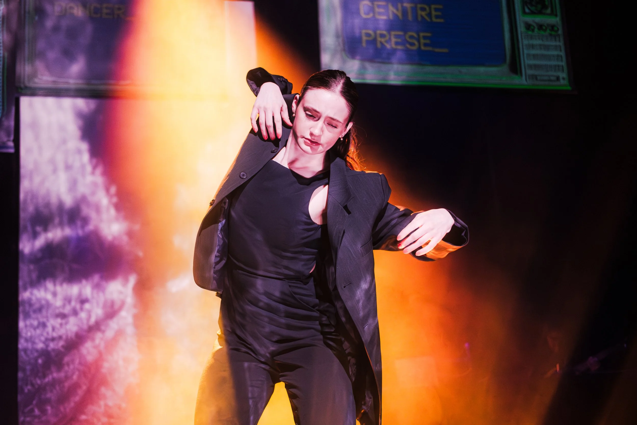 Opening the night, one by one, performers approached what is perceived to be a projector-style mirror, backs turned to the audience, speaking affirmations into their reflections. “I am who I present myself to be.” The gesture set the tone for the night: an inward-facing reckoning that would soon spill outward. From there, the cast launched into a David Byrne–esque choreography — angular, rhythmic, slightly uncanny — with Sierra Oszust appearing in an oversized suit, her movements exaggerated and precise. As the performers began chanting “I love my body. I am my body. I am all of us,” they ran toward the audience, collapsing the distance between stage and seats and making it immediately clear that this was not a show meant to be observed passively, but to be engaged with.