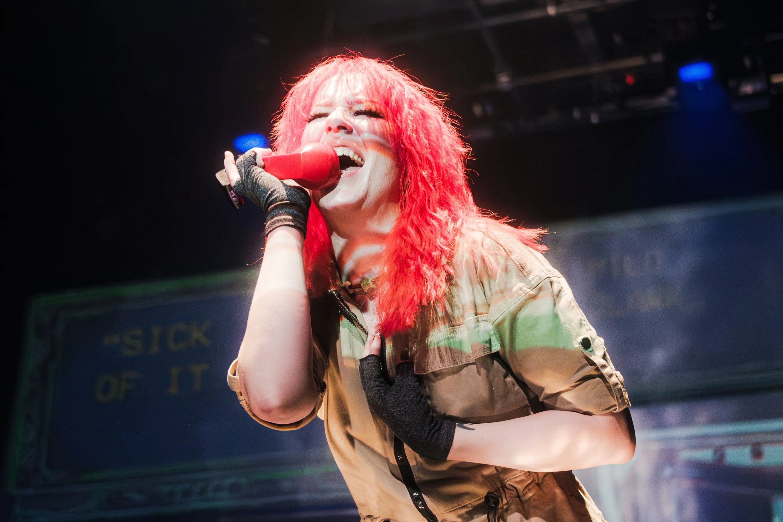 After the intensity of Woyzeck, SHY FRiEND stepped fully into the spotlight. “NEVER BEEN A SINNER” erupted into collective joy, the audience clapping along as the band leaned into theatrical excess. “SICK OF IT” pushed that energy outward, with Jubs grabbing a handheld phone microphone, yelling into it while running through the crowd and climbing to the top balcony — a literal elevation of voice and body within the space.