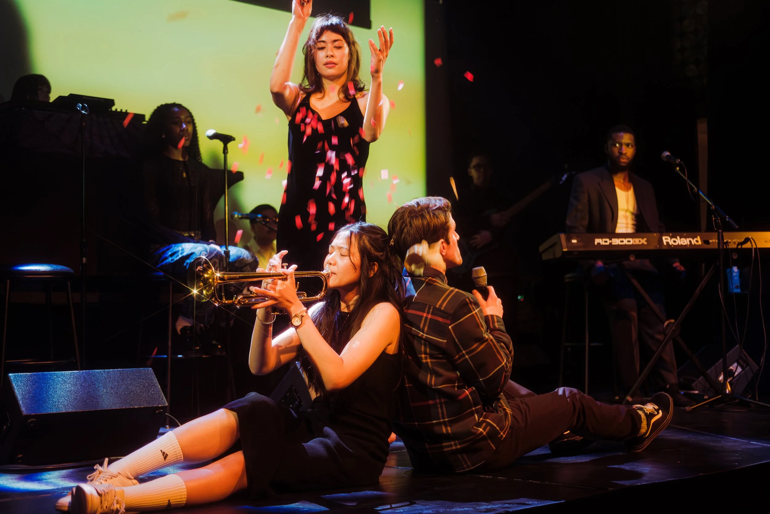From the outset of TD Amplify’s program Episode 2 of their series, the stage at Werklund Centre felt transformed. A wash of saturated reds, greens, and blues bathed the room while (un)decided — the eight-piece R&B/neo-soul collective — settled into groove-heavy warmups that blurred rehearsal and performance. There was confetti that fluttered. A trumpet gleamed under the lights. Introspective moments like trumpet-player Jesse Natasha and Matthew Mooney sitting back-to-back on the floor, preparing for confession, and using as much space provided for expression as they could.